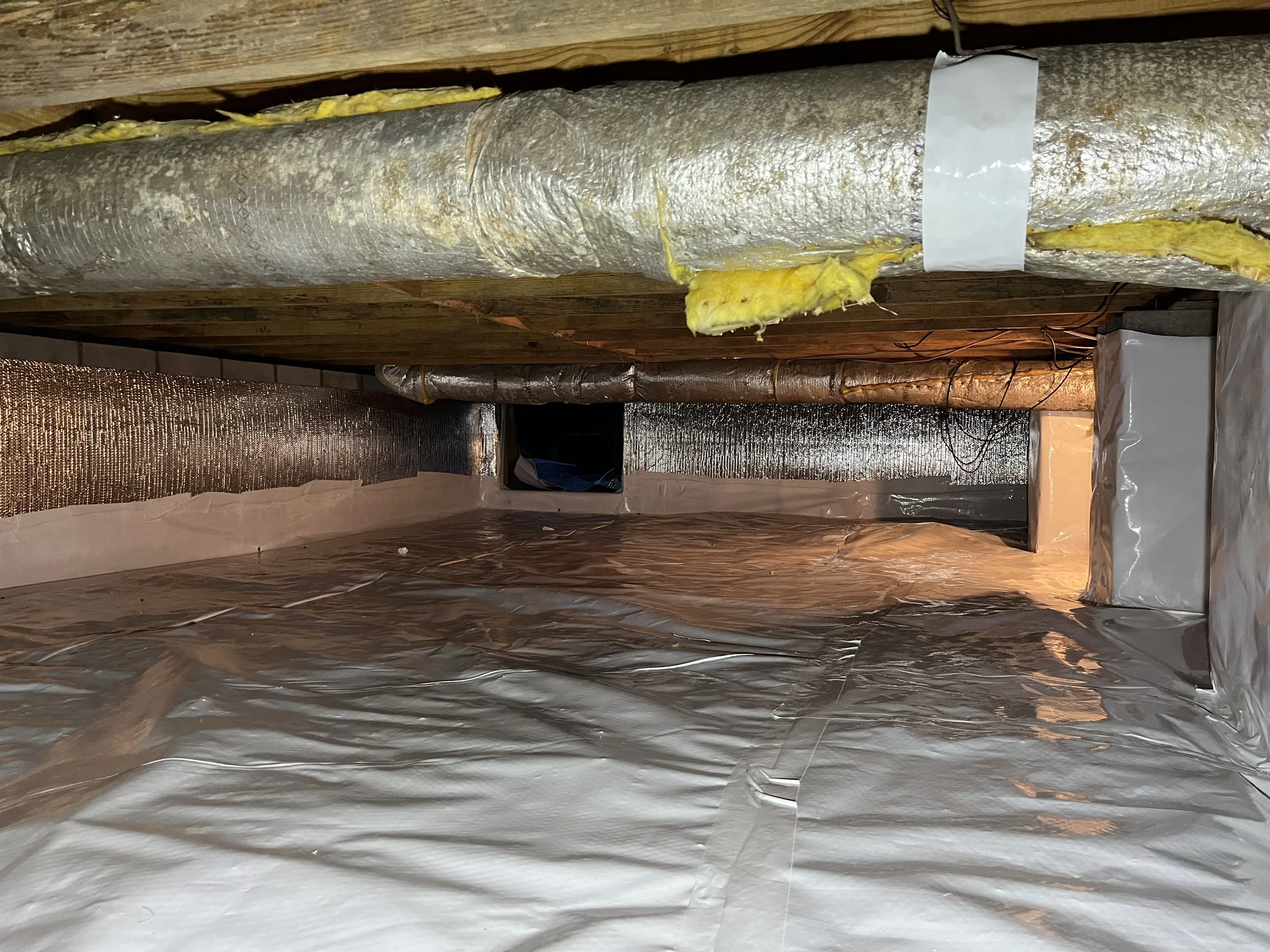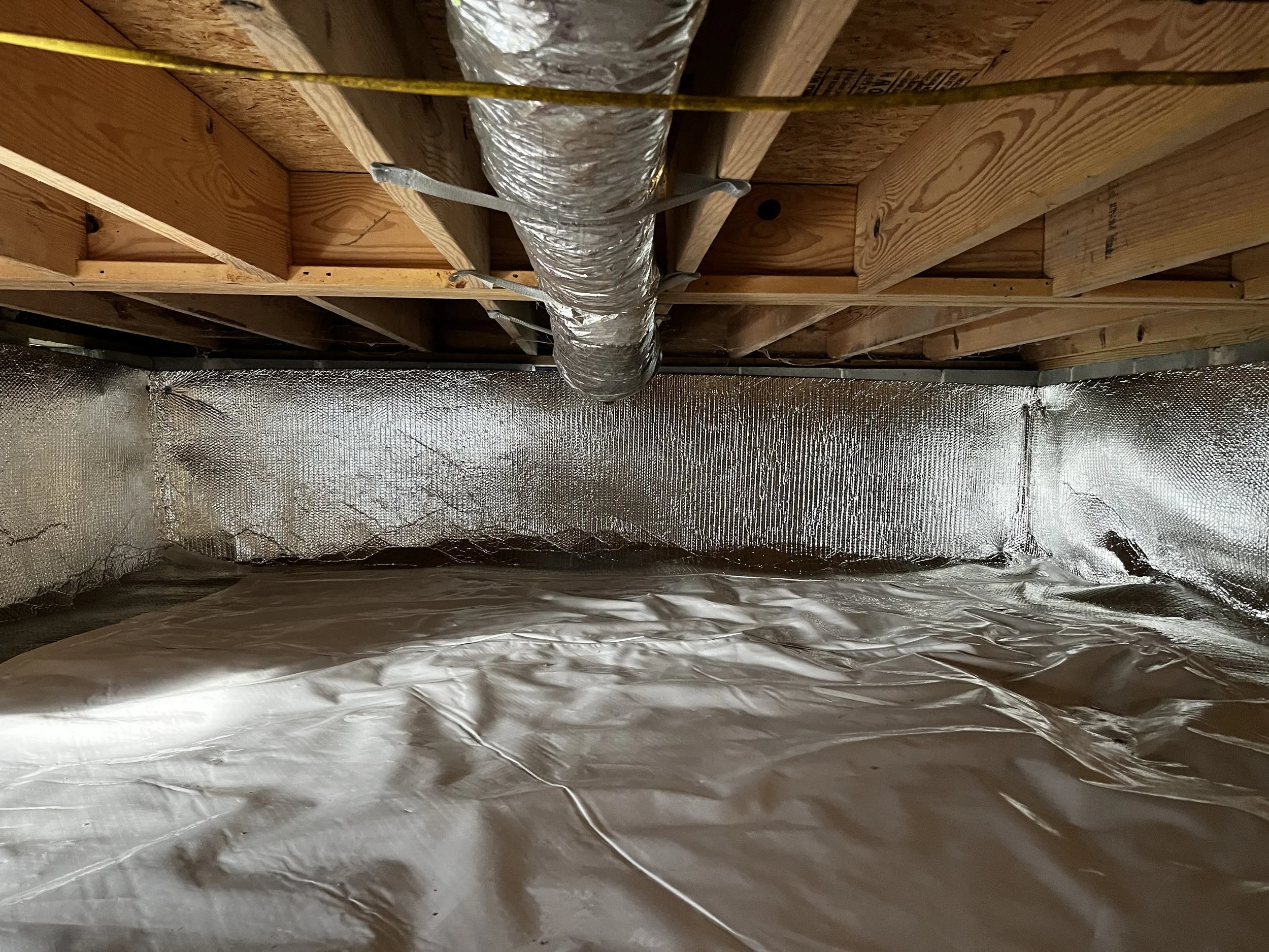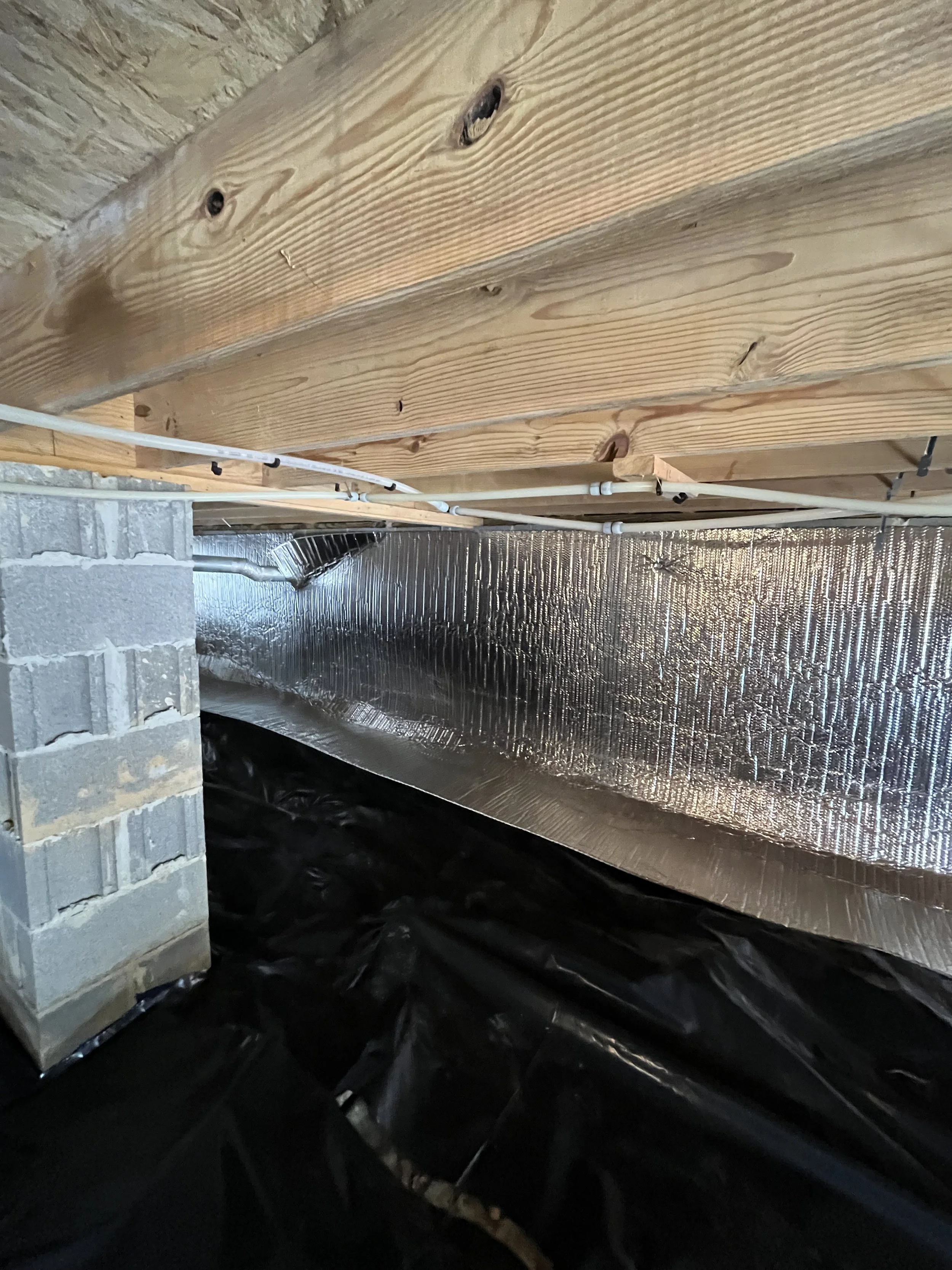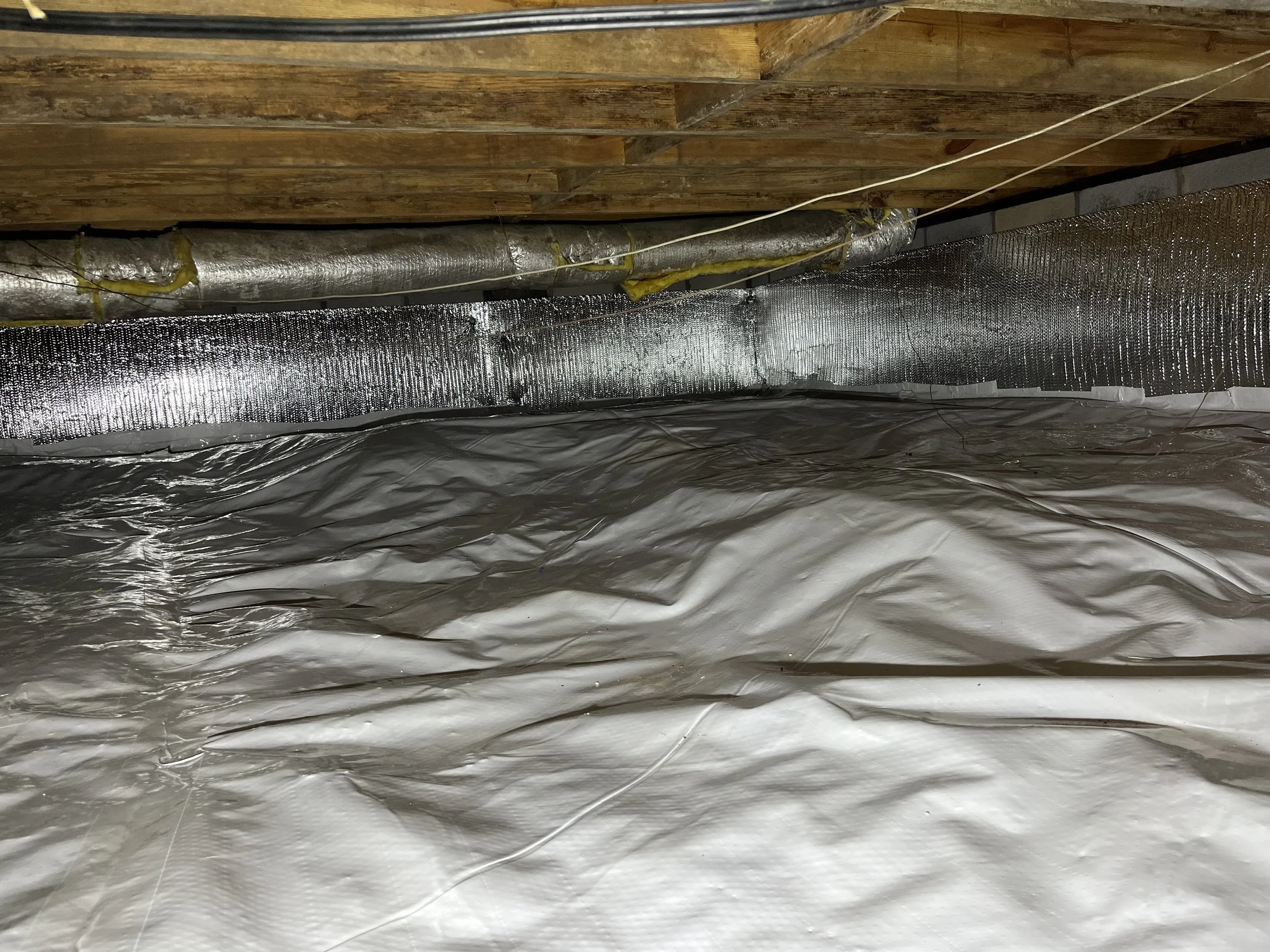 View of a crawl space with insulation and vapor barrier on the floor, wooden beams and pipes overhead, and ductwork in the background.