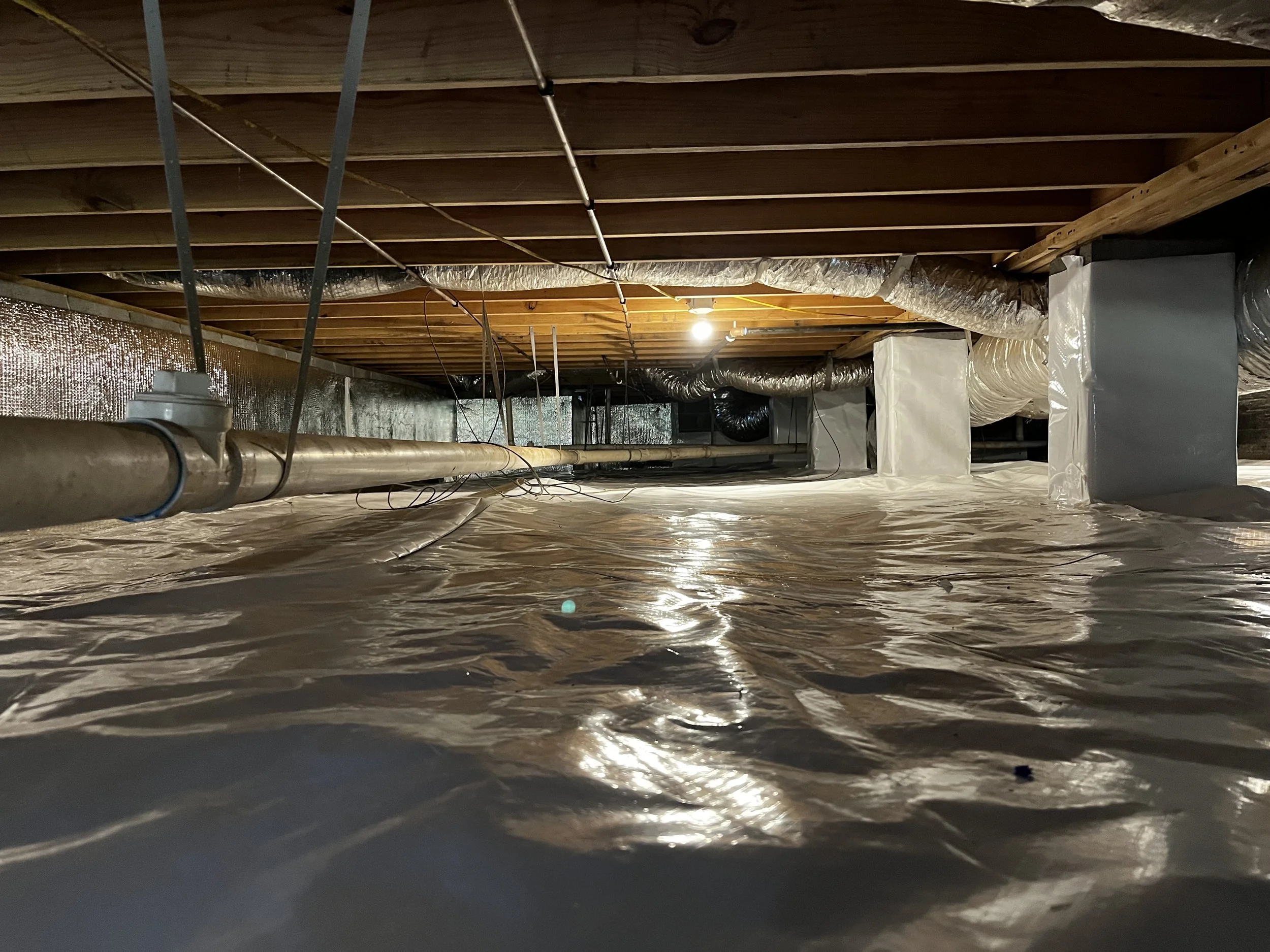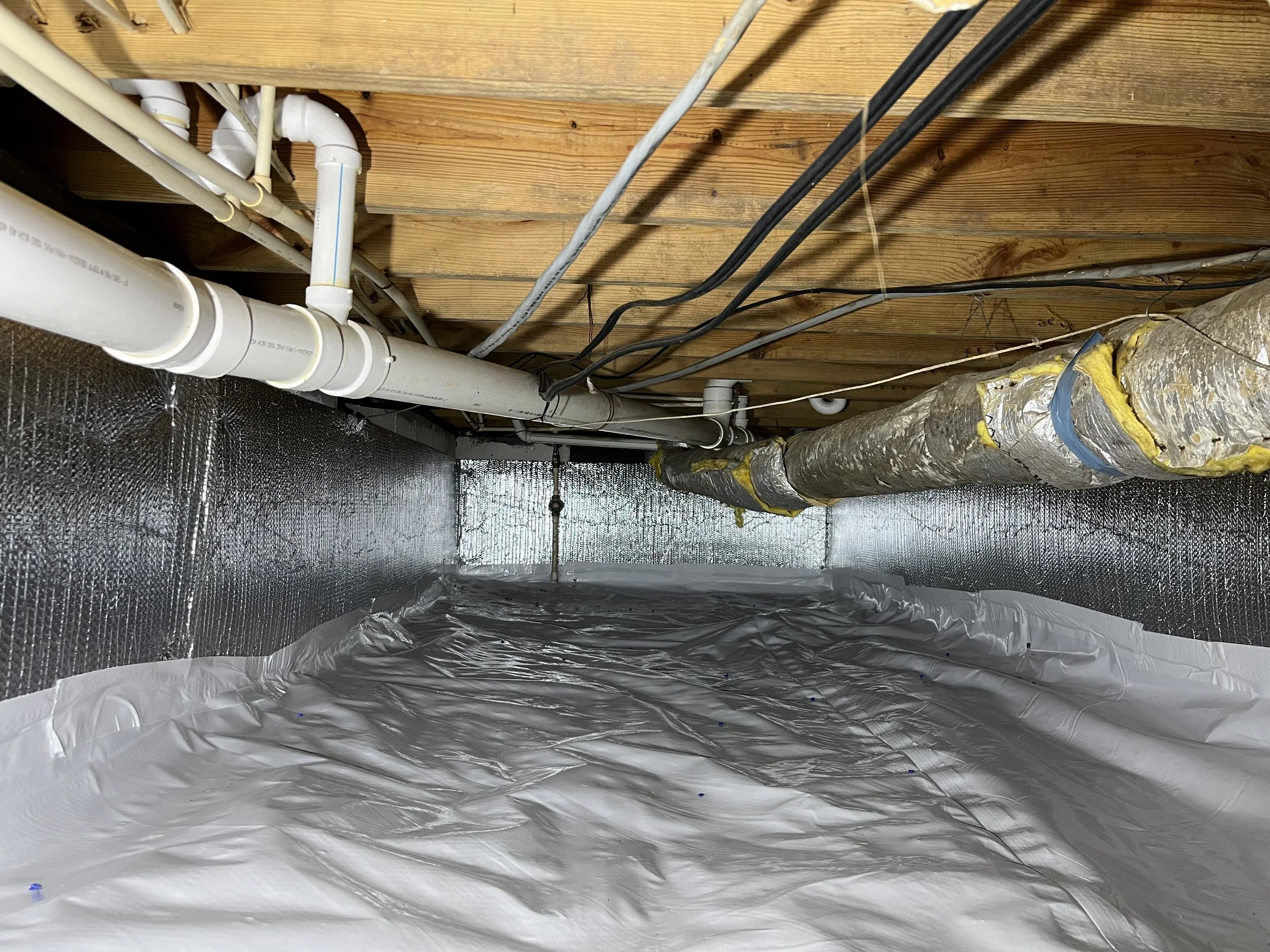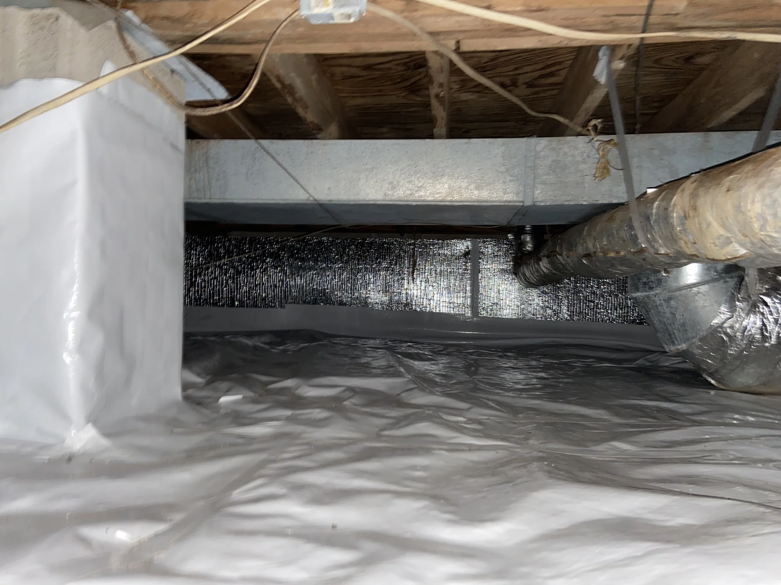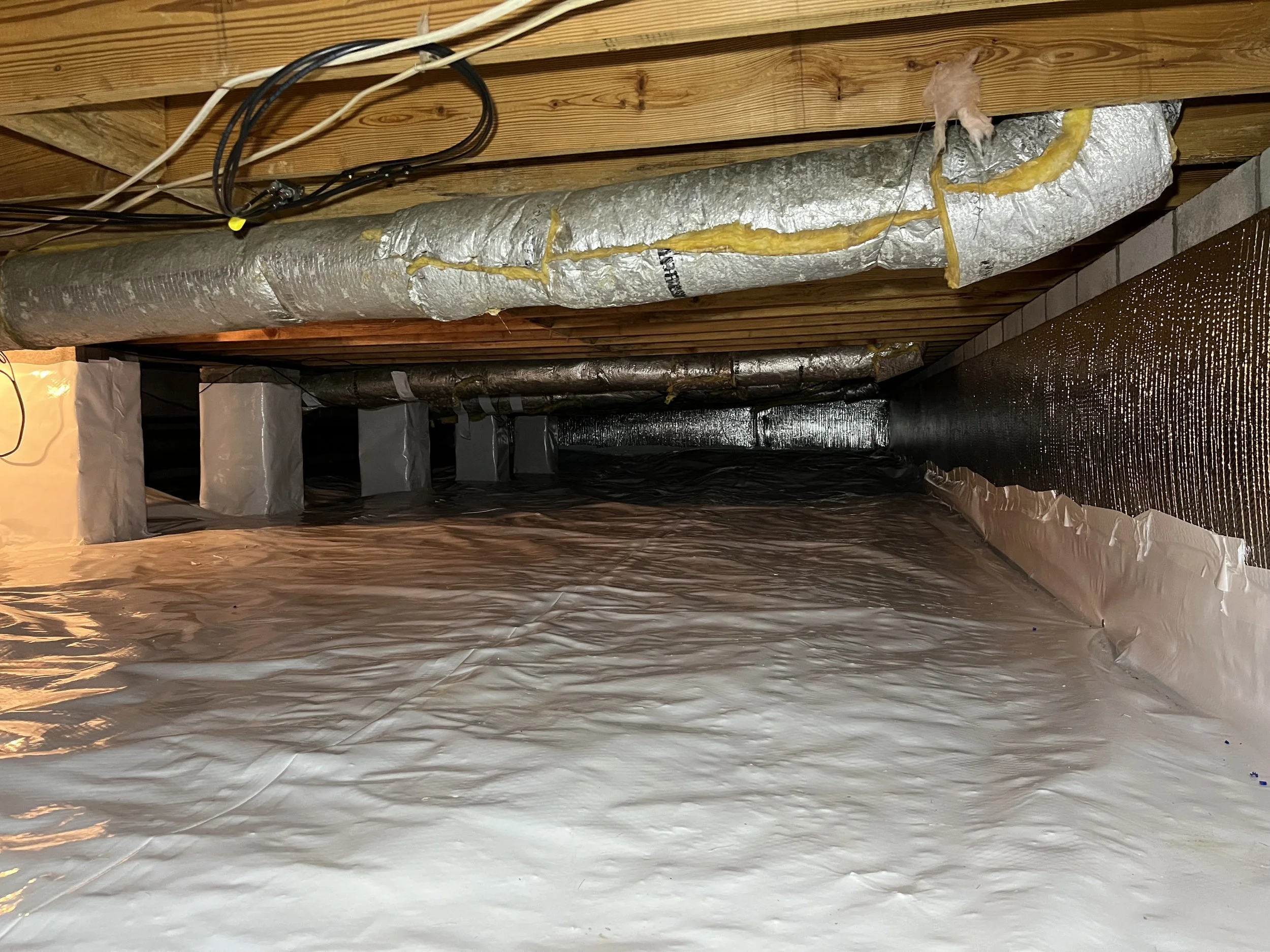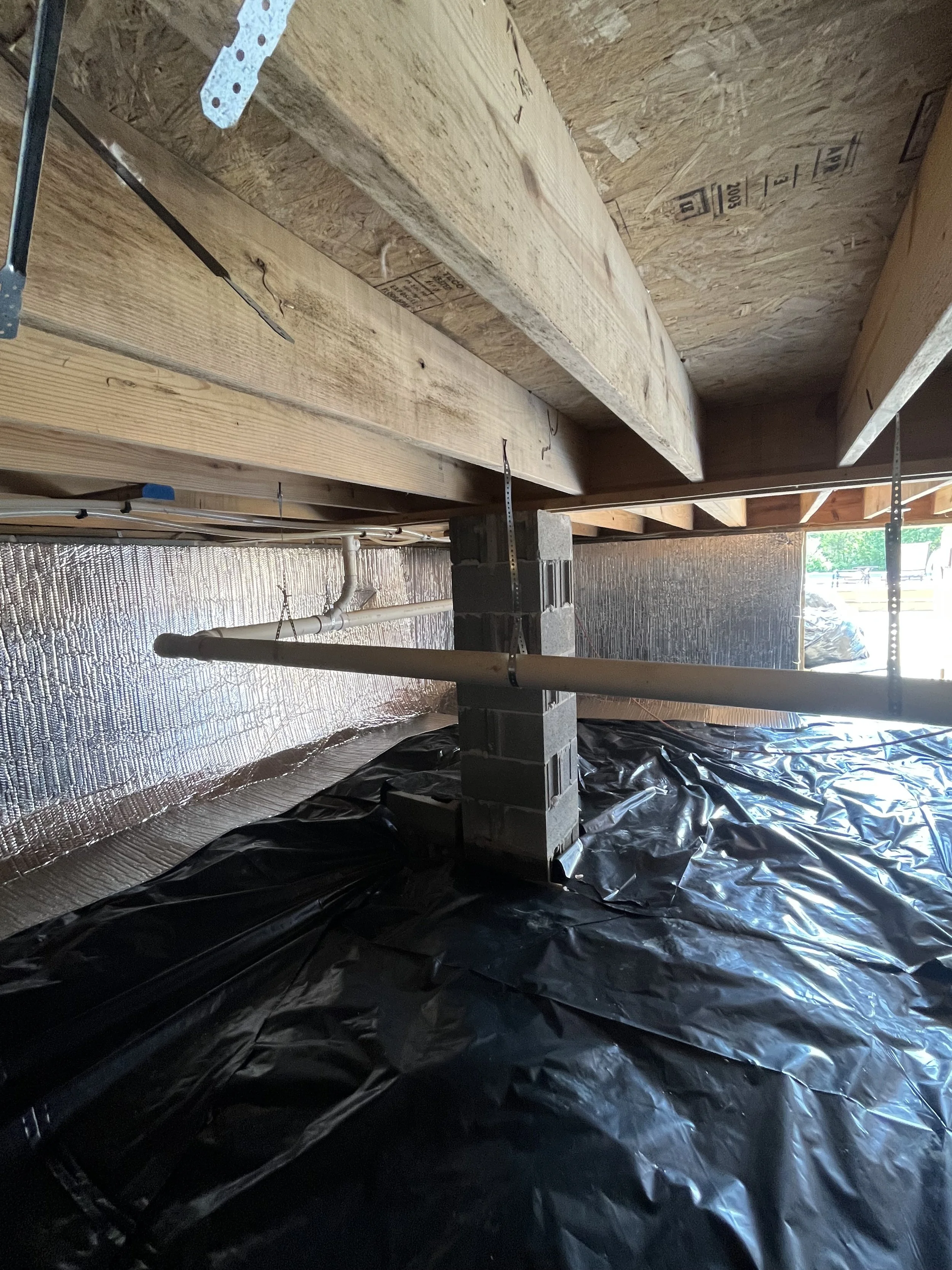 View of a crawl space with insulation and vapor barrier on the floor, wooden beams and pipes overhead, and ductwork in the background.