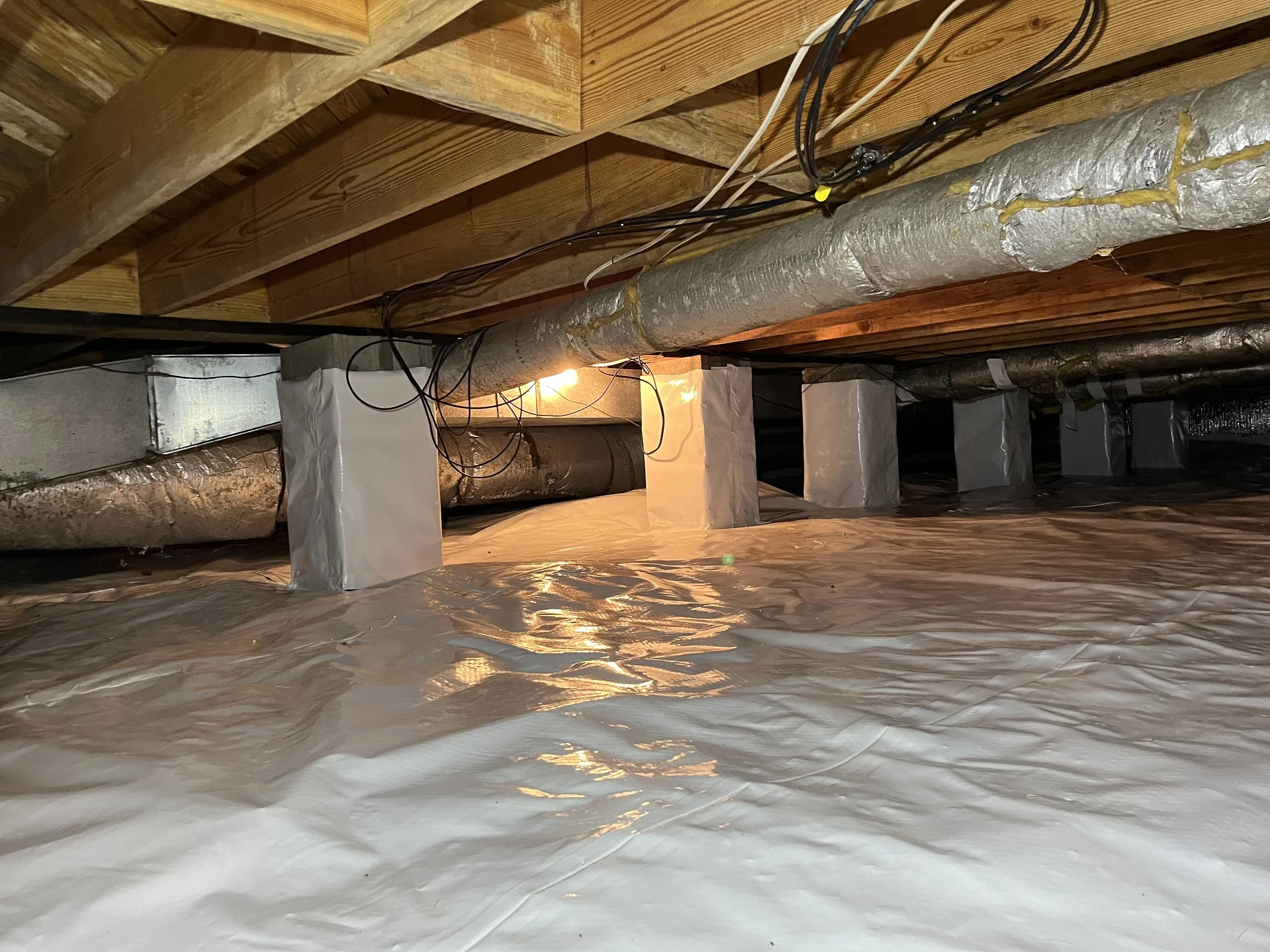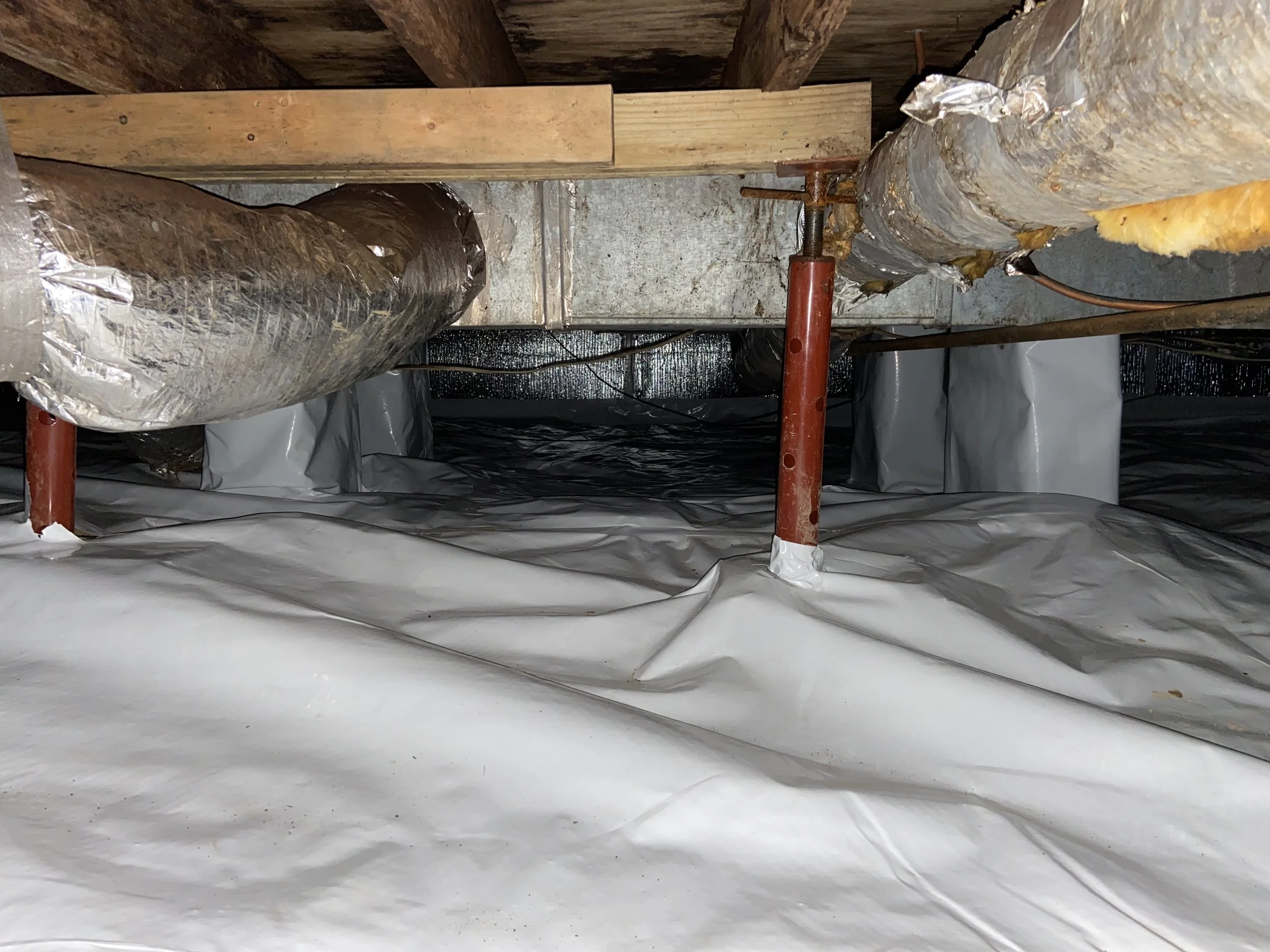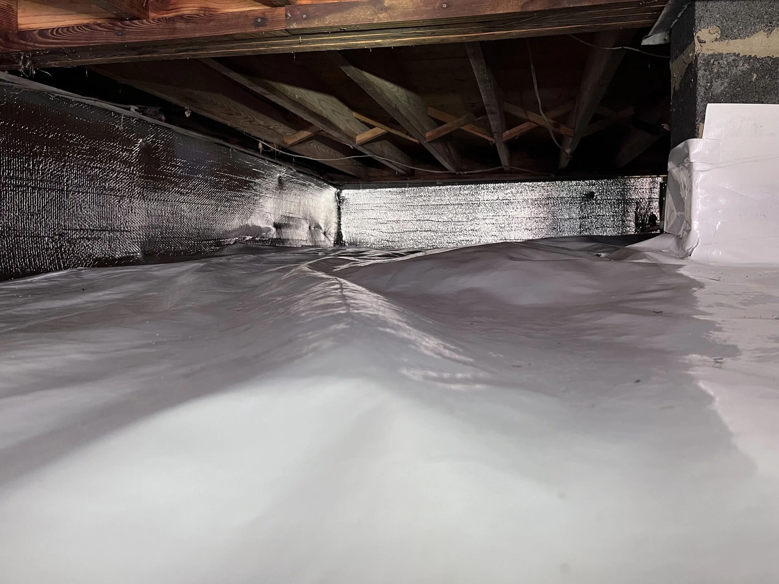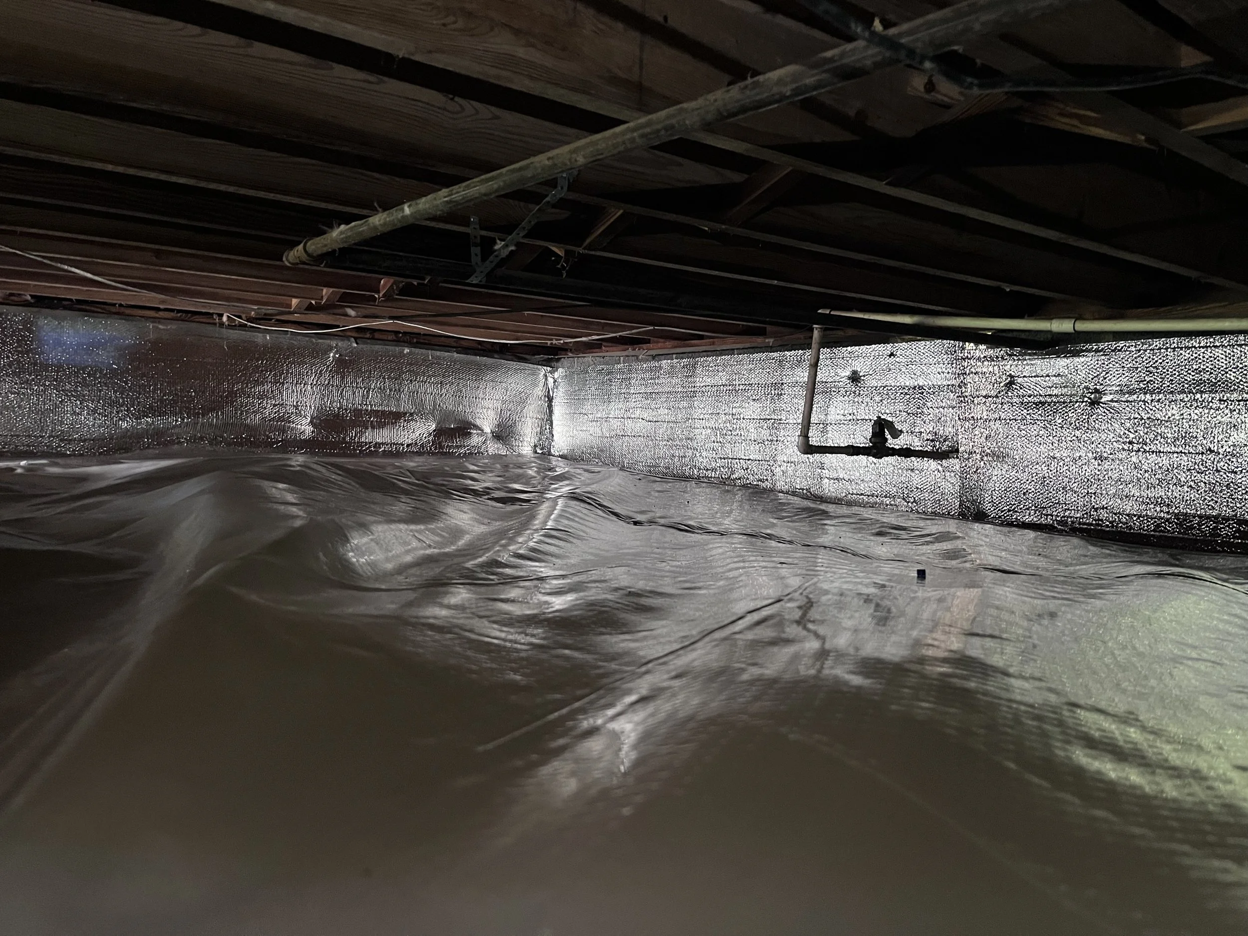 View of a crawl space with insulation and vapor barrier on the floor, wooden beams and pipes overhead, and ductwork in the background.