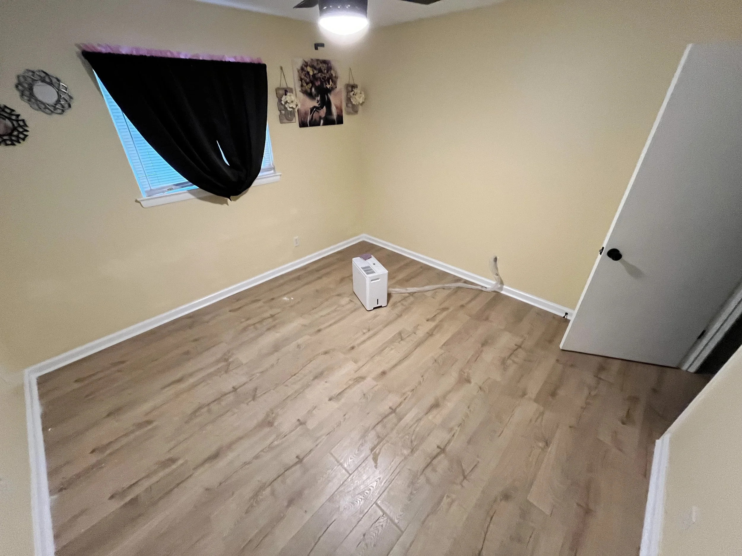 Empty room with beige walls, hardwood flooring, a window with a black curtain, a white vent on the floor, a white door slightly open, and wall decorations including a picture and two wall hangings.