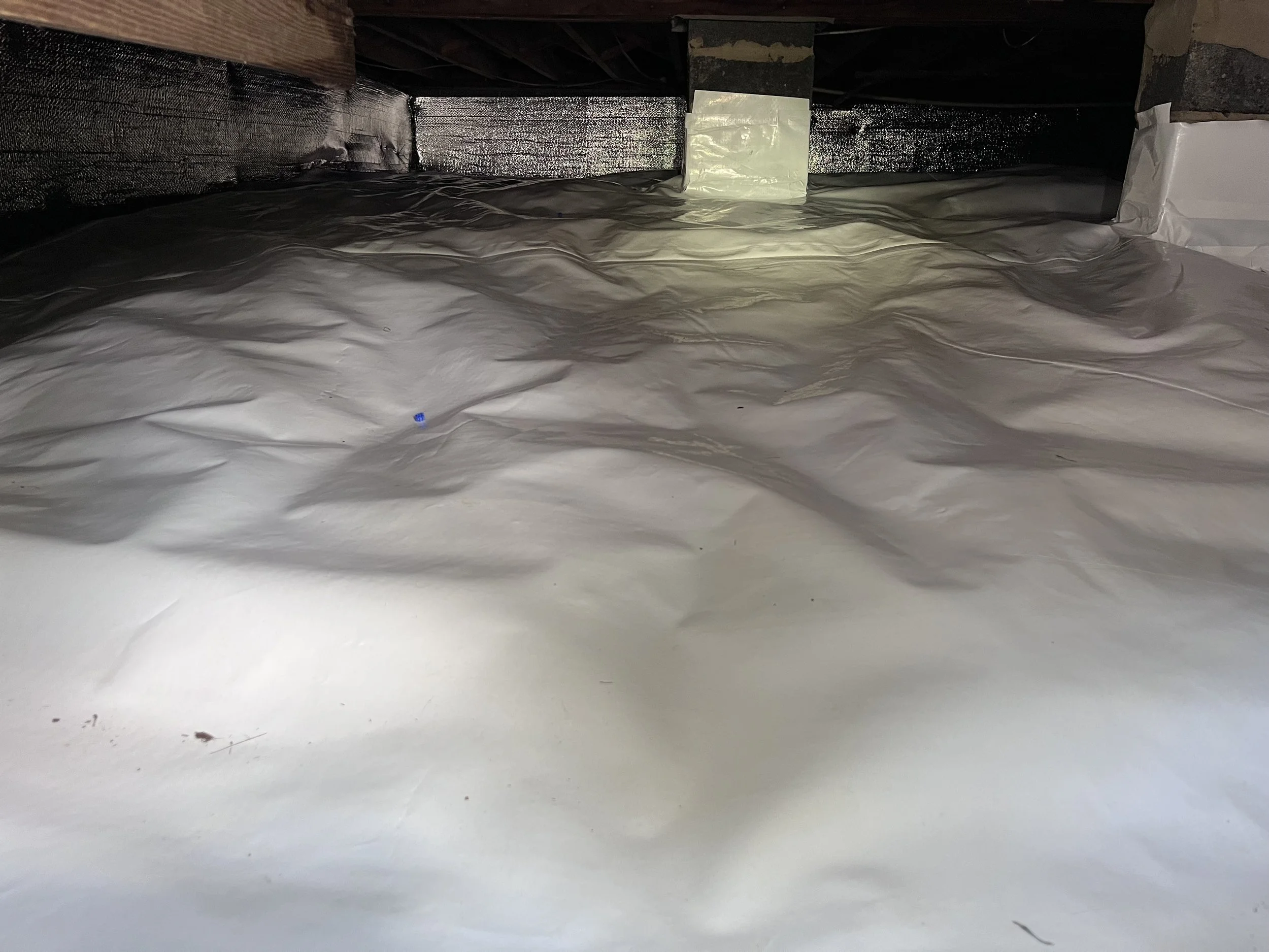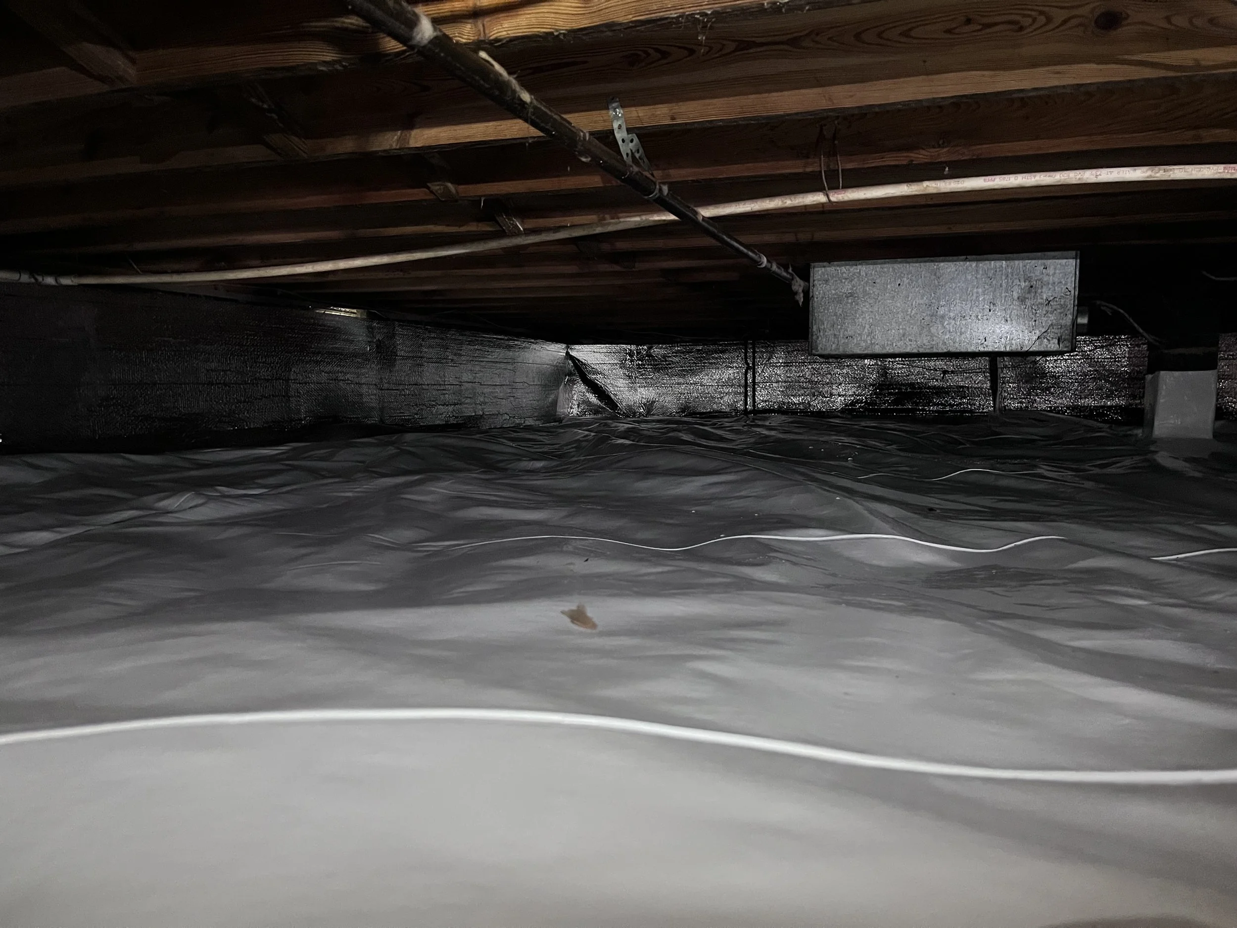 View of a crawl space with white vapor barrier on the floor, black insulation on the walls, and pipes and electrical wiring overhead. A white control box is visible on the right side.