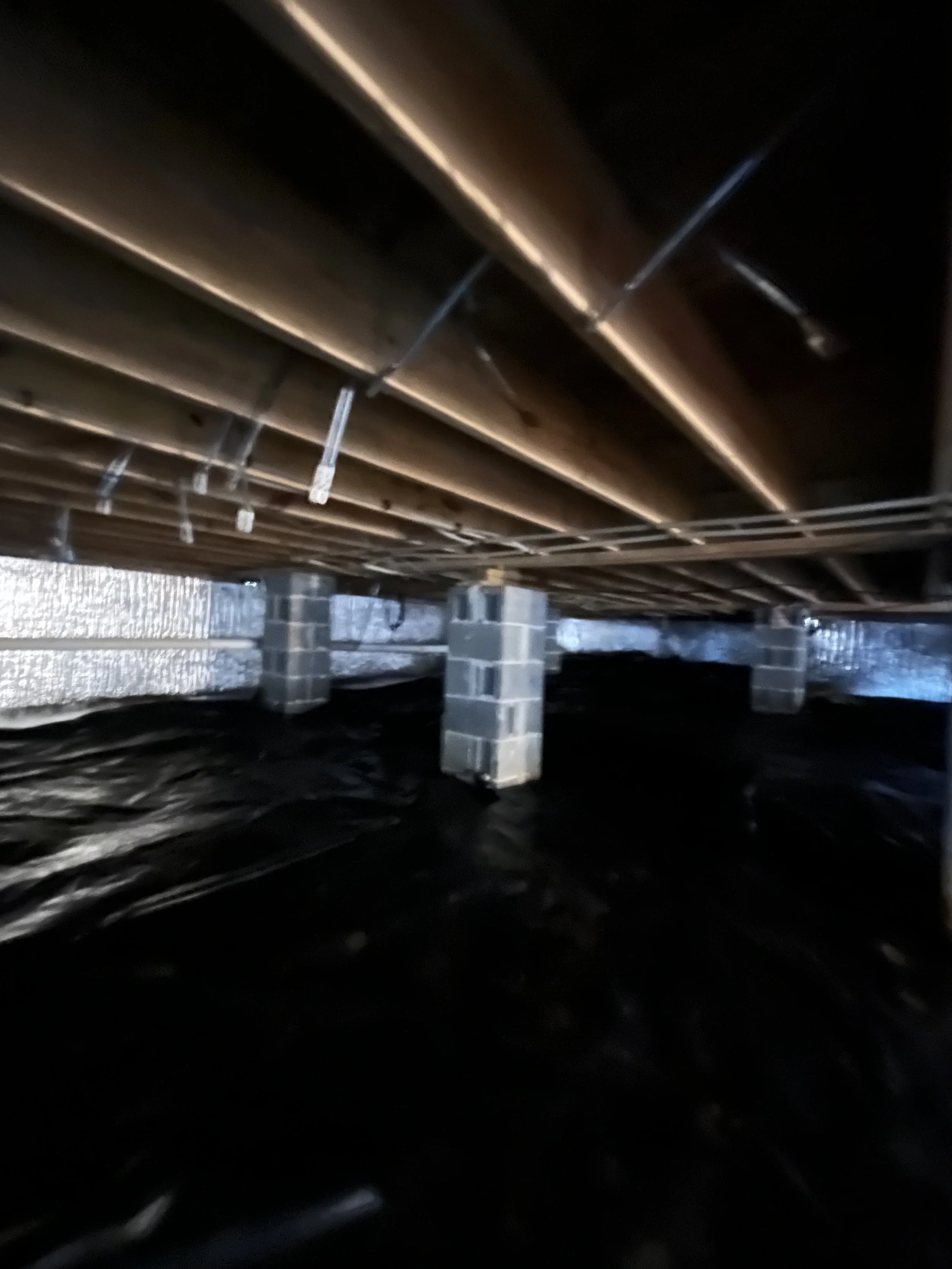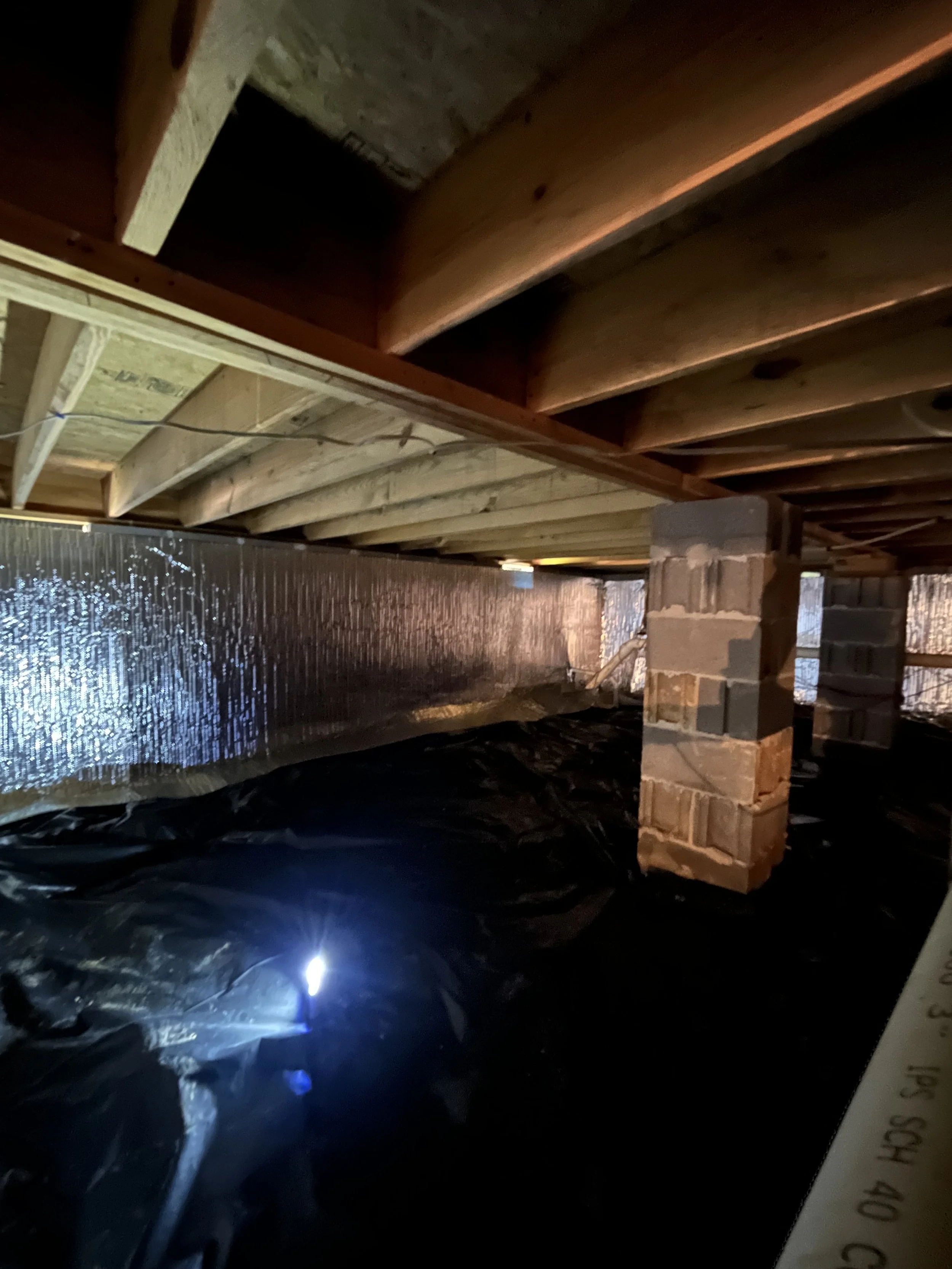 View of a building's crawl space showing wooden floor joists, a brick support pillar, and a reflective barrier along the walls, with a light illuminating the space.