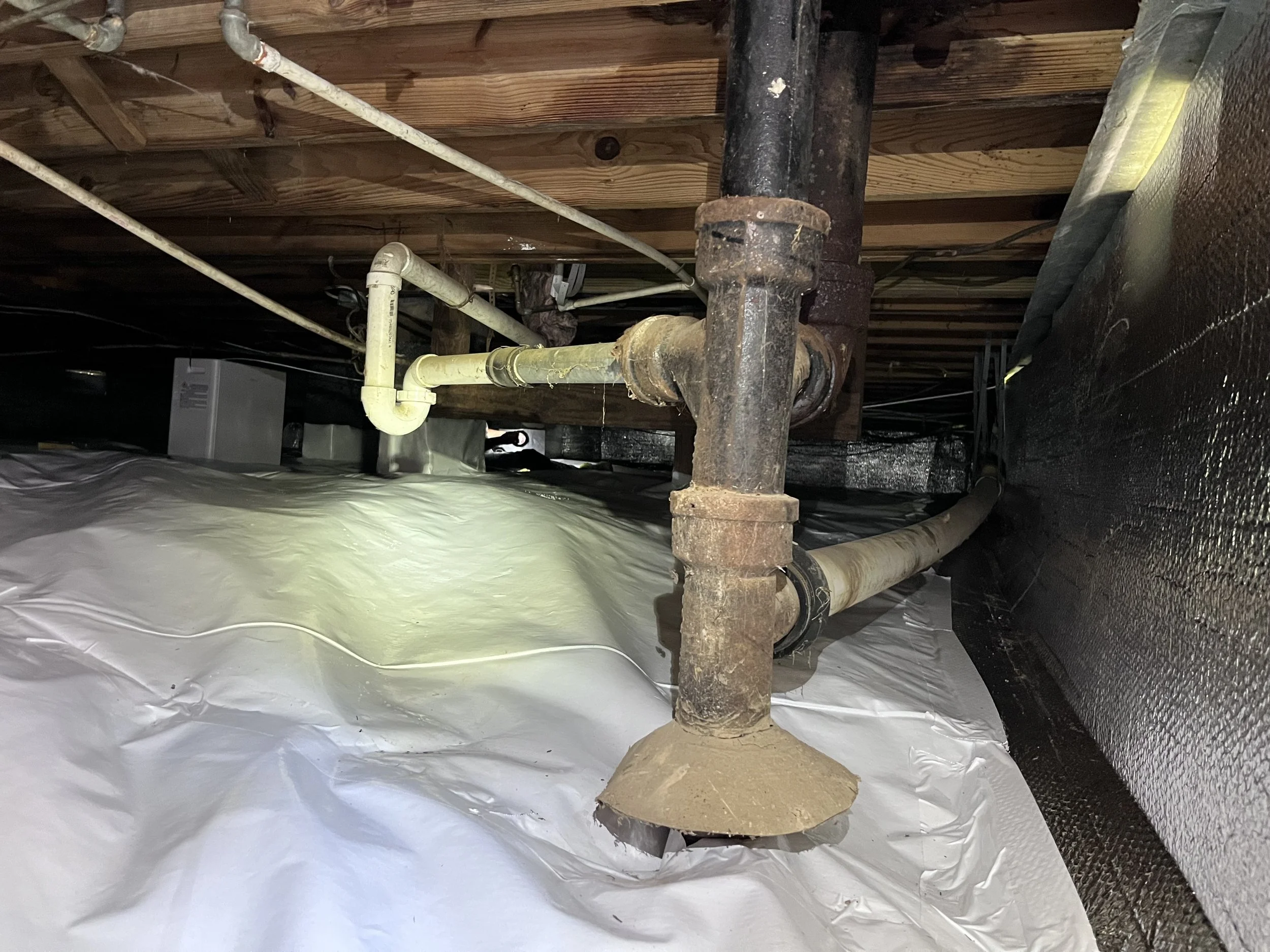 View of a house foundation with wooden beams, cinder blocks, PVC pipe, and black plastic sheeting on the ground.